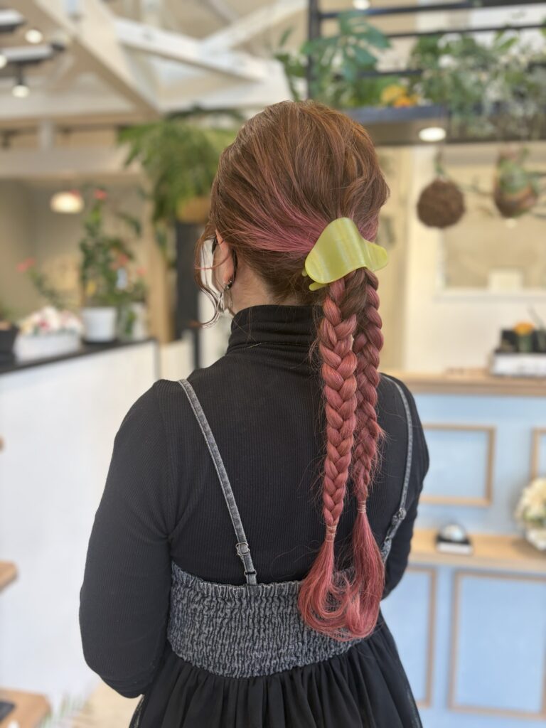 ④束を2つに分けて、それぞれ三つ編みをしてくくる。