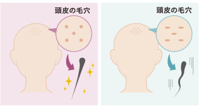 頭皮の衰えなどによって、毛穴が楕円形に歪みます。さらに頭皮の下にある毛包(髪の毛が生えてくる通り道)も歪んでしまいます。 一般的に健康な髪の毛は、毛根から毛包を通って真っ直ぐ生えます。 しかし、毛包が歪んでいると、表面に出てきた髪の毛があちこち違う方向を向いてしまい、うねりが出やすくなります。