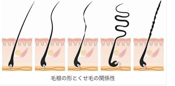頭皮もお肌と一緒ですから、加齢でたるむことで毛穴が歪んでしまうのです。そもそもなぜ毛穴が歪むとくせ毛になってしまうのでしょうか。 ストレート毛の毛穴は頭皮に対してまっすぐであるのに対し、くせ毛は頭皮の中で曲がっています。髪の毛は毛穴を通って頭皮表面に出てきます。 ストレート毛のようにまっすぐな毛穴では、髪の毛は360度均等に圧力がかかった状態で押し出されるため髪は歪みません。一方、くせ毛の曲がった毛穴では髪の毛が偏った圧力のもとで押し出されるため髪がカールしてしまうのです。