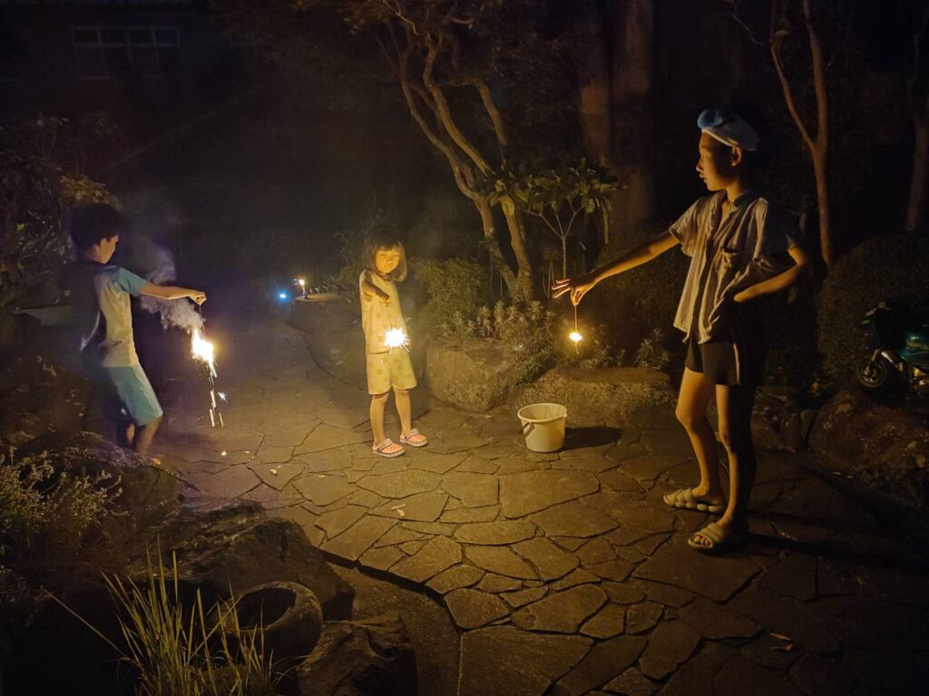 お盆休みは夫の実家へ行ったので、みんなで花火をやりました🎆🎇