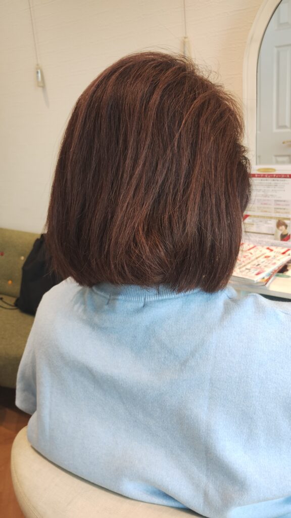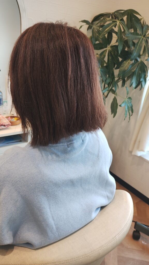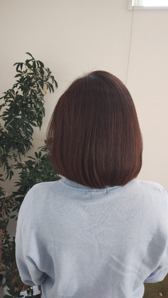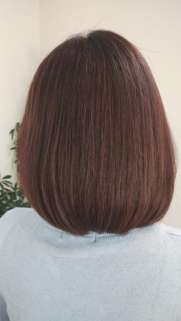見ていただくとわかるように、毛先まで自然な丸みが出て、つるんとしたツヤボブに。 広がりもおさまり、指通りもかなり滑らかになりました✨