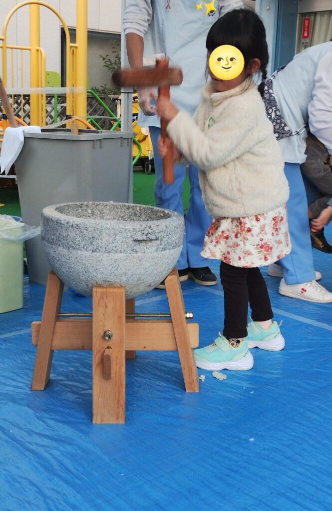 先日保育園のもちつき会を行いました。「よいしょ!」の掛け声に合わせて、先生と一緒に楽しくもちつき体験。笑顔いっぱいの、素敵な時間になりました⛄