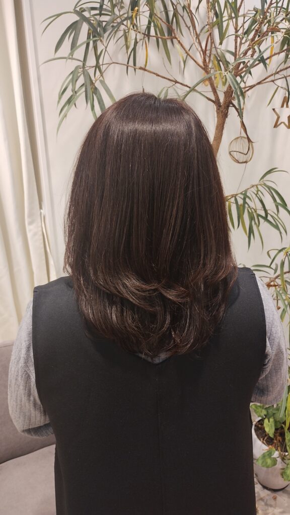 ベースは肩につく長さのミディアム。表面にやわらかくレイヤーを入れることで、動きと軽さが出つつ、後ろ姿も自然な丸みのあるシルエットに✨